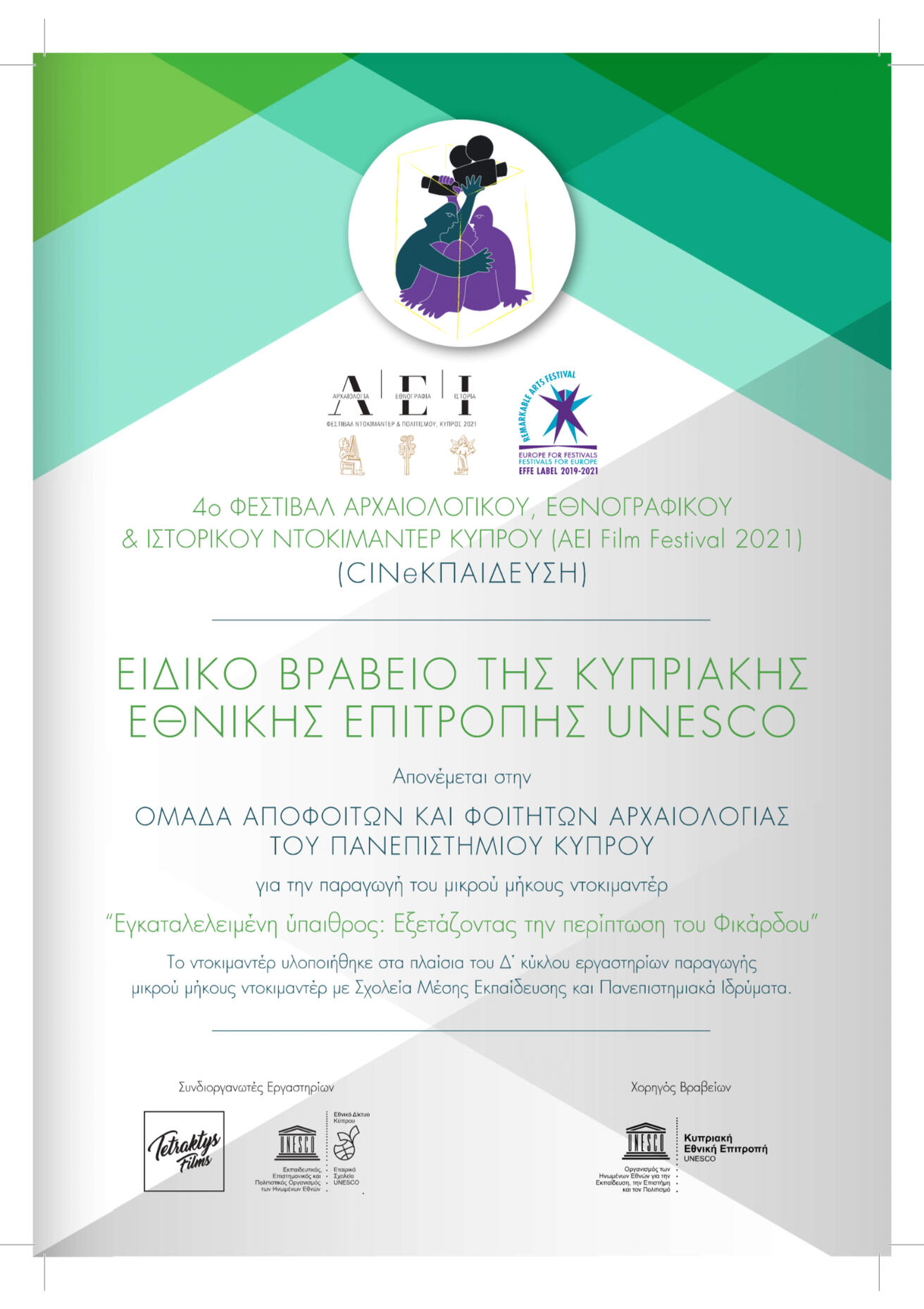 El Premio Especial de la Comisión Nacional de Chipre UNESCO por un cortometraje documental que promueva el patrimonio cultural y/o natural de Chipre fue otorgado a nuestra Unidad de Investigación Arqueológica por la película "Campo abandonado: examinando el caso de Fikardo".